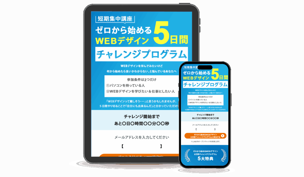 初心者向け無料講座「5日間チャレンジプログラム」への参加者増加を目的とし作成しました。 信頼感のあるブルーと行動喚起のオレンジ で配色し、初心者が安心して申し込めるようシンプルで読みやすいことを意識しました。