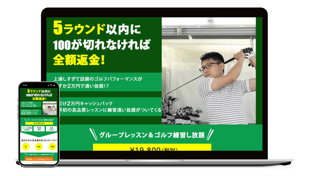 「短期間で確実に成果が出るゴルフレッスン」という信頼感を伝えることと、ゴルフのイメージを重視しました。全額返金保証や受講生の成功事例を前面に押し出し、具体的な実績を示すことで安心感が出るように制作しています。