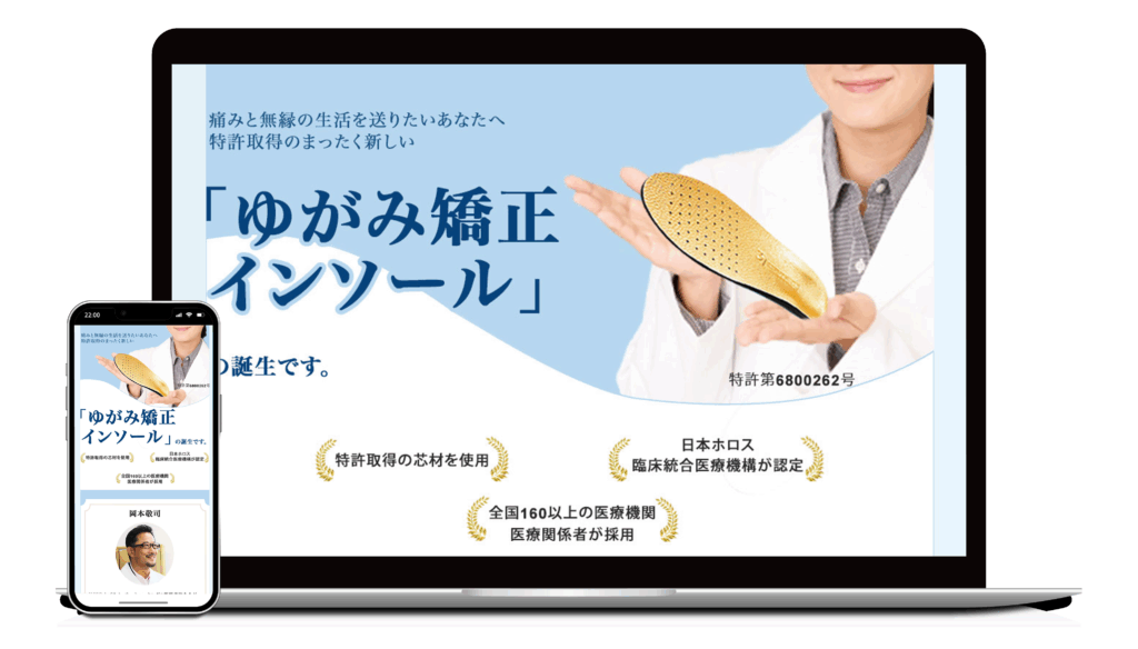 足のゆがみを整え、正しい姿勢をサポートするインソールの魅力を伝えるために制作しました。 淡いブルーと白を基調に 清潔感と信頼感のあるデザイン に仕上げ、専門家の声や実績をわかりやすく掲載しています。